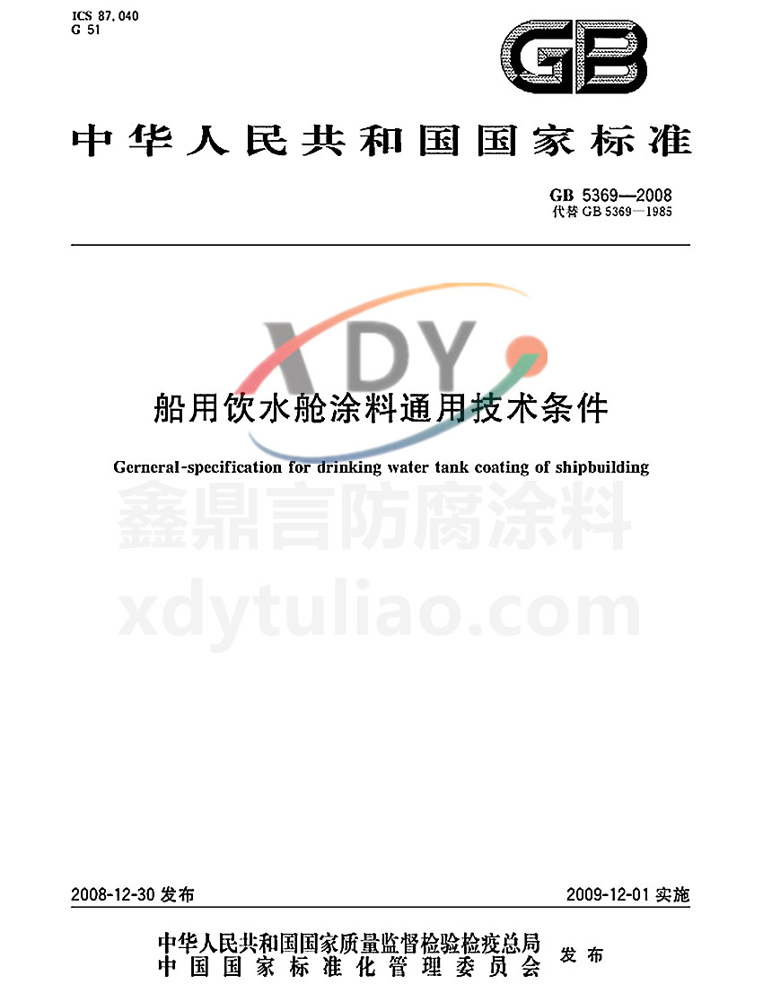 ICS87.040 G51 GB 中華人民共和國國家標(biāo)準(zhǔn) GB 5369-2008代替GB 5369-1985 船用飲水艙涂料通用技術(shù)條件 Gerneneral-specification for drinking wanter tank coating of shipbuilding 2008-12-30發(fā)布 2009-12-01實(shí)施 中華人民共和國國家質(zhì)量監(jiān)督檢驗(yàn)檢疫總局 中國國家標(biāo)準(zhǔn)化管理