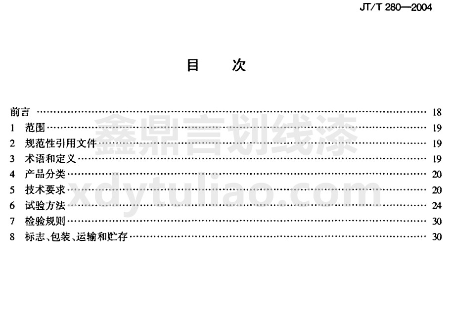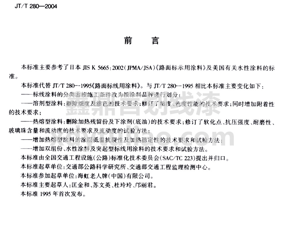 JT/T 280-2004路面標線涂料標準是小編照搬JT/T 280-2004《路面標線涂料》紙質版內容,大家可以放心參考。更多防腐涂料執(zhí)行國家和行業(yè)標準等防腐涂料相關信息可以參與網(wǎng)站:m.aichuanshipin.com