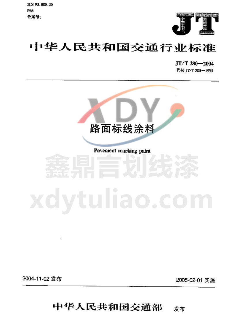 JT/T 280-2004路面標(biāo)線涂料標(biāo)準(zhǔn)是防腐涂料小編照搬JT/T 280-2004《路面標(biāo)線涂料》紙質(zhì)版內(nèi)容,大家可以放心參考。更多防腐涂料執(zhí)行國家和行業(yè)標(biāo)準(zhǔn)等防腐涂料相關(guān)信息可以參考官網(wǎng):m.aichuanshipin.com ICS 93.080.30 P66 JT 中華人民共和國交通運(yùn)輸行業(yè)標(biāo)準(zhǔn) JT/T 280-2004路面標(biāo)線涂料Pavement